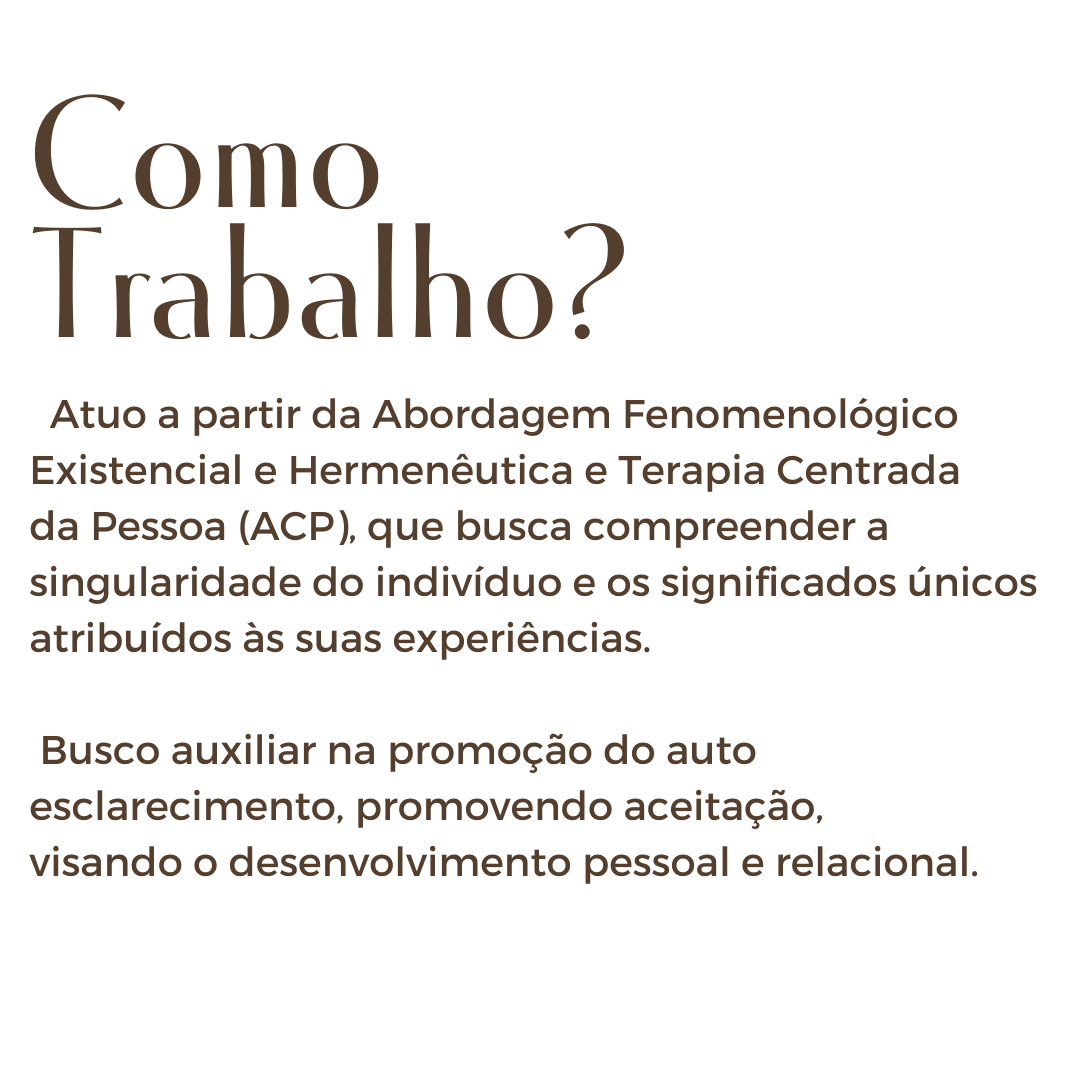 Meu compromisso é promover um ambiente seguro, onde se possa, através a fala, explorar a própria existência, incentivando a autorreflexão e autenticidade, sempre pautada na empatia, ética, liberdade e respeito. Juntos, podemos buscar clareza sobre possibilidades no mundo.